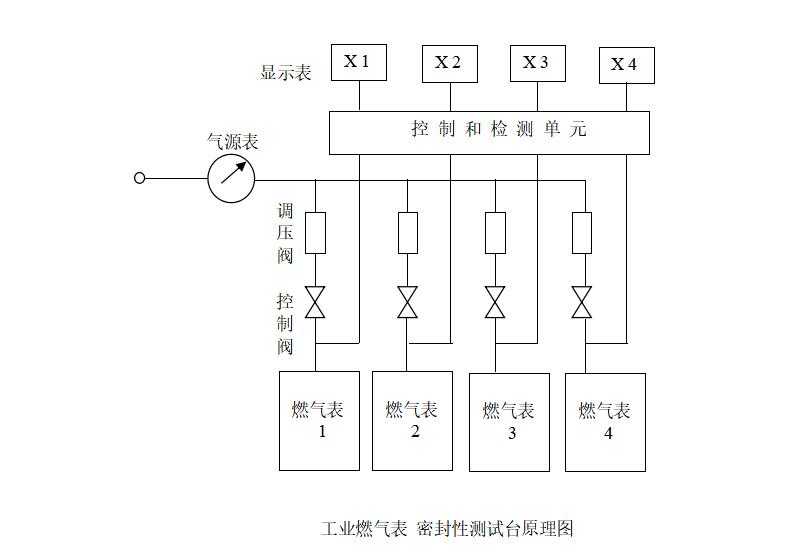 該檢測裝置的工作原理是利用調(diào)壓器,提供一個壓力穩(wěn)定的檢定壓力,采用控制閥,分別控制各臺被檢燃氣表的充氣加壓。閉氣檢測期間多臺被檢燃氣表之間互相隔離,由智能數(shù)字表顯示測試壓力,和壓力變化量。在檢定規(guī)程規(guī)定的3分鐘時間內(nèi)壓力變化不超過允許值確定合格,否則即為漏氣。
